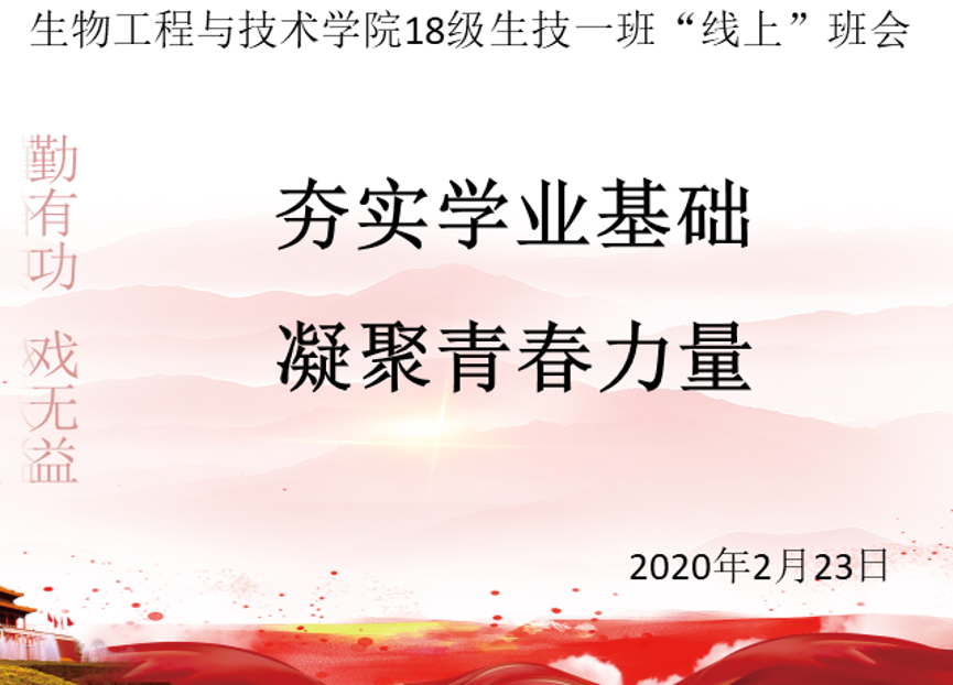 为积极响应学校号召,在共克疫情特殊时期,在线班会,硬核在线。2020年2月23日晚七时,w88win优德18级生物技术一班利用腾讯视频和雨课程在线召开“夯实学业基础,凝聚青春力量”的主题班会。班会由班主任李一婧在线主持召开,全班38位同学均参加了本次班会。