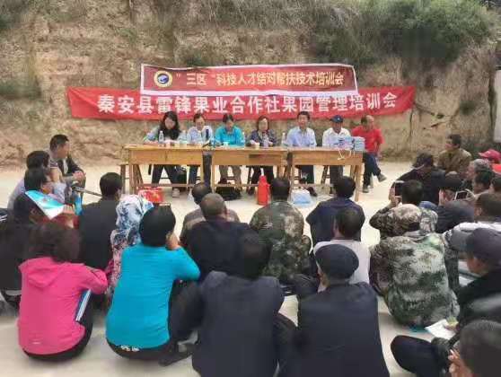 2016-2020年,团队积极响应中央组织部、国家科技部等五部门《关于印发<边远贫困地区、边疆民族地区和革命老区人才支持计划科技人员专项计划实施方案>的通知》精神,每年选派3-8人赴当地贫困县区参与科技帮扶工作,5年来先后选派了28人次作为“三区”科技人才赴天水市秦安县五营镇薛李村、麻沟村、雒塬村秦,魏店乡大湾村、王窑村、麦积区花牛镇董源村、新阳镇温集村等15个乡31个村开展了形式多样的科技帮扶工作。针对秦安魏店乡和五营乡两个帮扶点的技术需求选定呼丽萍研究员,邹亚丽副教授作为两个帮扶点的团队负责人,开展了以“果树提质增效集成技术示范培训”为主要内容的科技扶贫工作。在帮扶期间,团队成员以各种方式举办果树科技知识和先进实用技术培训18次,培训农民2769 人(次),发放技术资料 1500 多份,随时利用电话、微信和短信答疑解惑农民技术问题不计其数,推广新技术、新产品18余项。帮助农户和合作社提高了认识、转变了观念,增强了依靠当地优势特色产业脱贫致富的能力。如秦安县魏店乡大湾村雷锋果业农民专业合作社的社员通过本团队的精准帮扶,农民人均增收1000元以上,该村按期实现了脱贫摘帽,所做工作深受农民欢迎。团队坚持将扶贫与扶志扶智相结合,充分发挥高校和省级科研平台在人才、技术、信息、仪器设备等方面的优势,助力脱贫攻坚,在加快科技成果向贫困地区的转移和转化,帮助天水五县二区贫困乡村农民依托林果产业,依靠科学技术脱贫致富方面做出了积极的贡献。