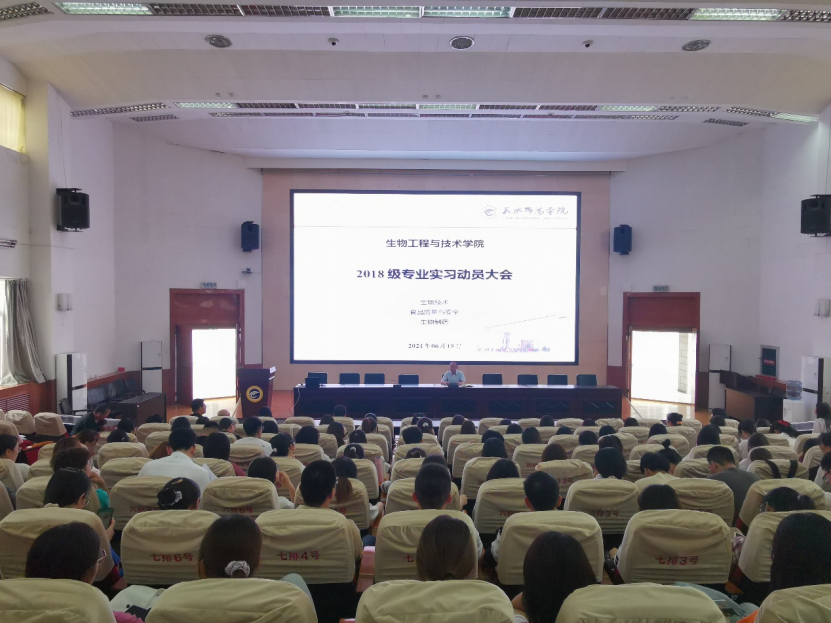 6月15日下午,w88win优德2018级非师专业实习安排及动员大会在2号报告厅召开。经理王廷璞,生物工程系主任刘艳梅,食品质量与安全系主任王丽莉,实习指导老师,生物技术、食品质量与安全、生物制药专业班主任及2018级全体同学共120余人参加了实习安排动员会。